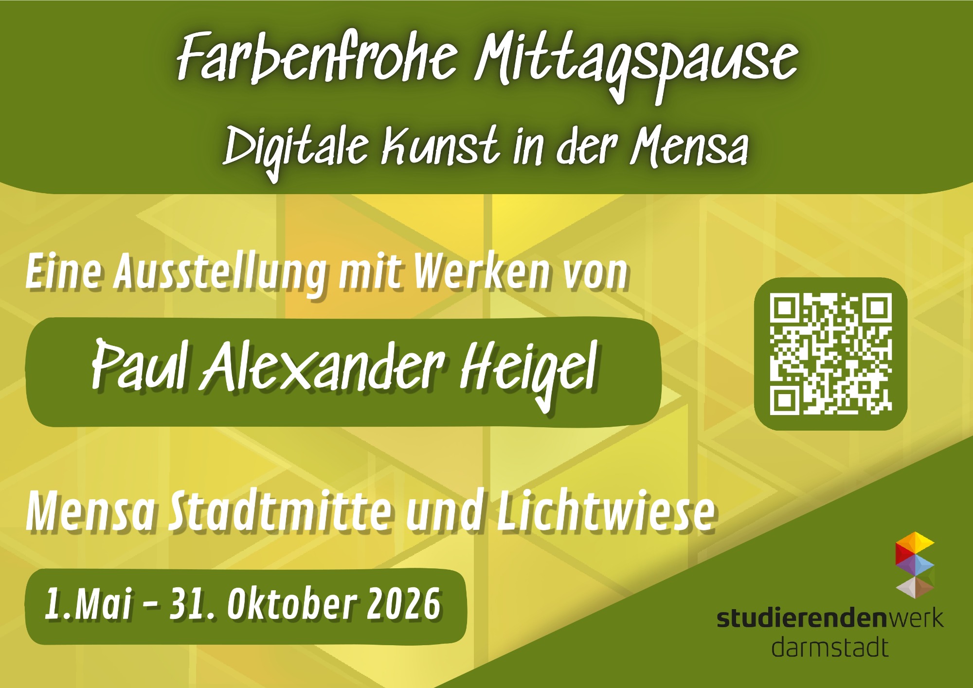 Über sechs Monate werden an den Standorten Mensa Stadtmitte und Mensa Lichtwiese ca. 80 meiner digital gestalteten Bilder zu sehen sein. Die Motive sind dabei sehr vielfältig. Von Pflanzen und Tieren, über Gruselige Figuren bis hin zu abstrakten digitalen Formationen und Stimmungsbildern. Insgesamt findet sich etwas aus all meinen Schaffensperioden. Die Ausstellung wird vom Studierendenwerk Darmstadt ausgerichtet und ermöglicht. Ich bin sehr gespannt auf die Reaktionen und freue mich darauf, die Bilder ab Mai 2026 zu präsentieren!