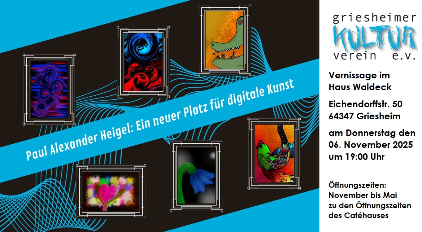 Die Ausstellung wurde in Kooperation mit dem Griesheimer Kulturverein organisiert und kann bis Mai 2026 im Seniorenzentrum Haus Waldeck besichtigt werden. Die Vielfältigkeit der ausgestellten Werke bietet einen Einblick in die digitalen Möglichkeiten und meinen sich wandelnden Stil. Entdeckt digitale moderne Kunst und lasst euch auf eine Reise durch farbenfrohe Bildwelten ein!