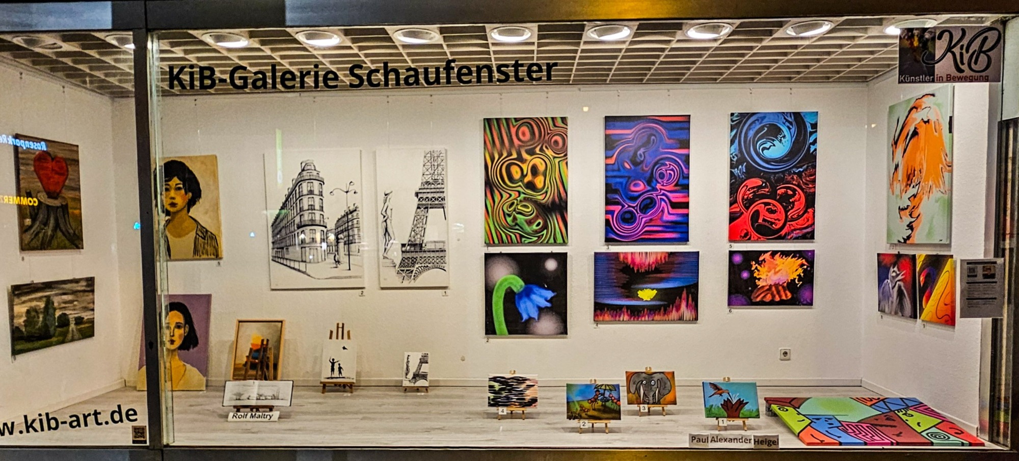 Im Galerie-Schaufenster der KiB-Künstlergemeinschaft in der Darmstädter Rheinstraße präsentiere ich regelmäßig für jeweils einige Monate im Jahr eine kleine Auswahl meiner Werke.